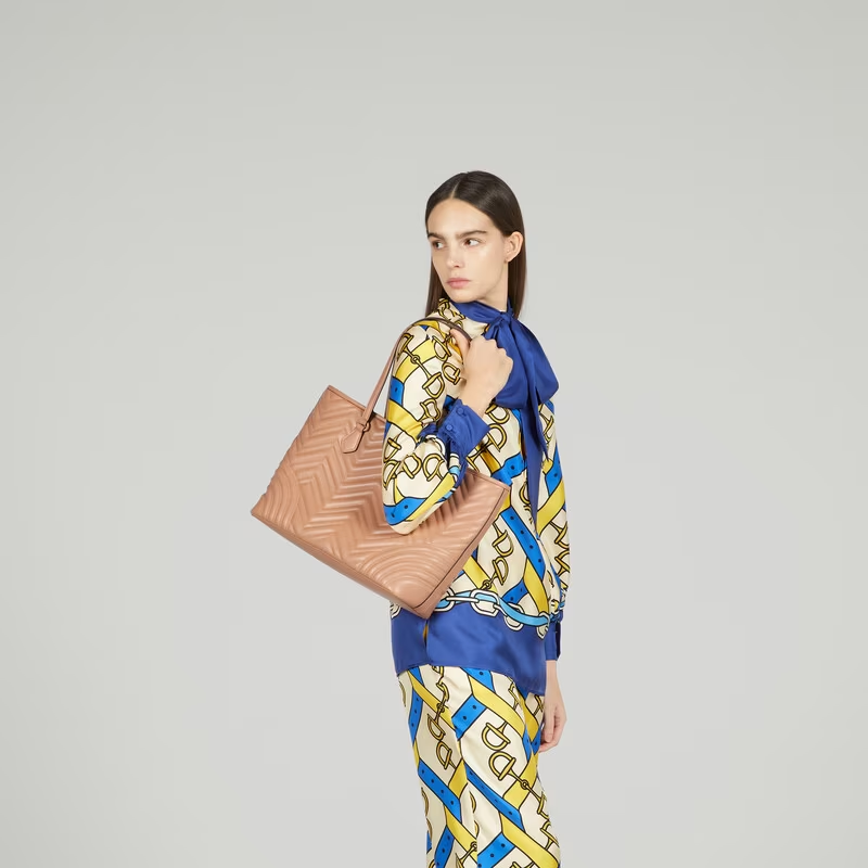 Com seu tecido matelassé reconhecível e hardware Double G, o GG Marmont tornou-se sinônimo da Maison. Continuamente reinventada ao longo das estações, novas formas são introduzidas nesta linha de assinatura, combinando com a visão contemporânea da Gucci. Esta sacola grande revela uma base chevron, aprimorando ainda mais o hardware tonal do logotipo.